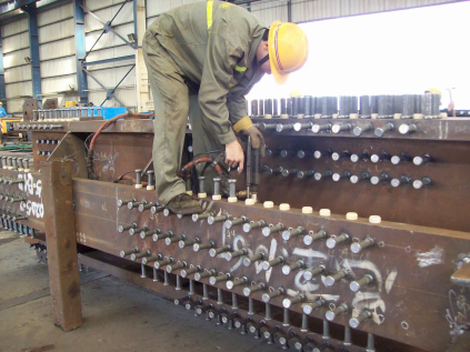Шпильки-упоры, приваренные к верхним поясам стальных балок перекрытий, служат закладными деталями при последующем бетонировании. В случае применения стального профилированного настила в качестве несъемной опалубки шпильки привариваются к балкам методом сквозного проплавления стального настила (для шпилек диаметром до 19 мм), либо через предварительно просверленное отверстие в настиле (для шпилек большего диаметра).