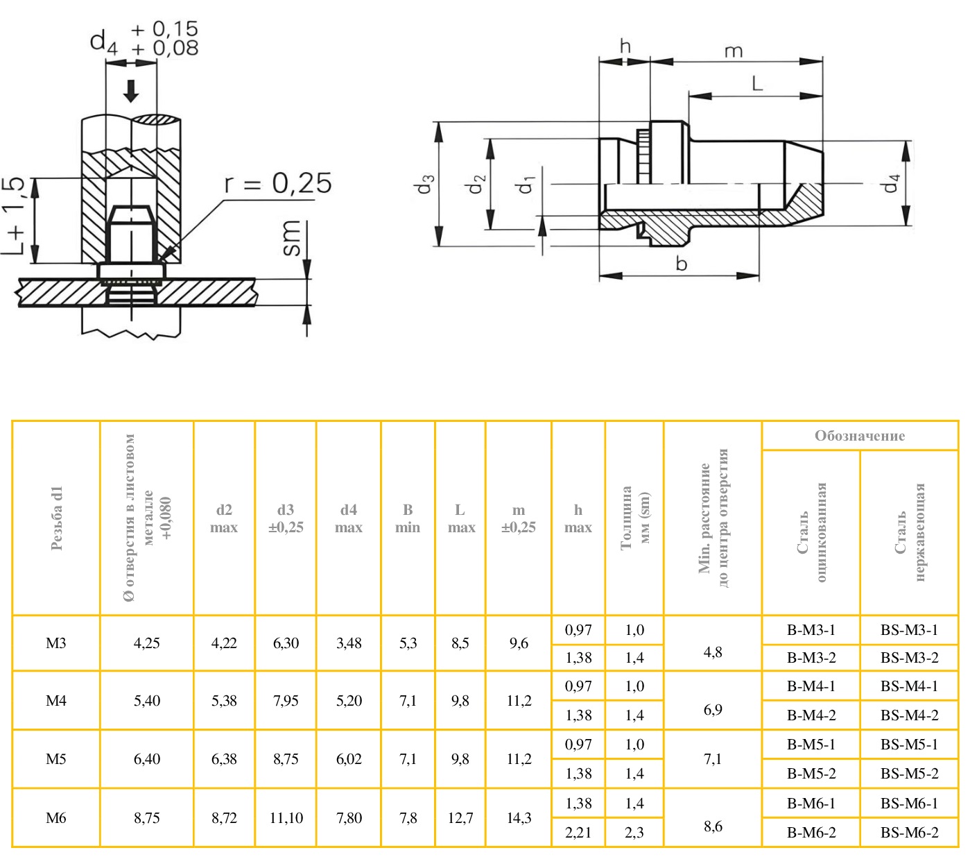 Высокая запрессовочная гайка типа B с закрытой внешней стороной из оцинкованной закаленной углеродистой стали. Оцинкованное покрытие продлевает срок службы гайки, повышая ее устойчивость к коррозии. Используется в случаях, когда требуется закрытый конец резьбы. Глухой конец ограничивает проникновение винта, защищая внутренние компоненты изделия от контакта с вкрученным винтом, а так же предотвращает попадание в резьбовое соединение влаги, пыли и загрязнений. Размерность от М3 до М6, высота гайки от 9,6 до 14,3 (±0,25) мм. Два варианта высоты обратного конуса гайки в каждой размерности, выбор которого зависит от толщины материала, в который будет запрессовываться крепеж. Рекомендована для монтажа в заготовки из углеродистой стали твердостью до HRB 80 и толщиной от 1,0 мм.